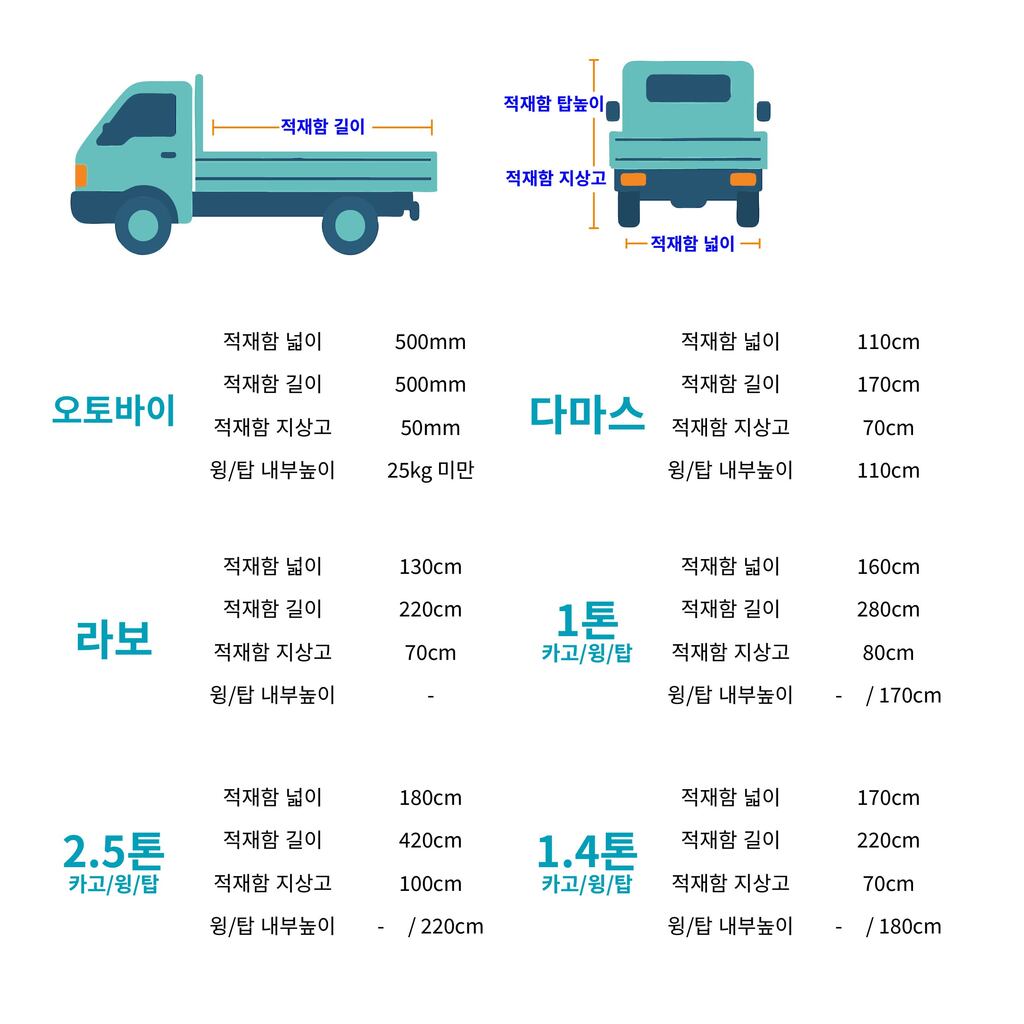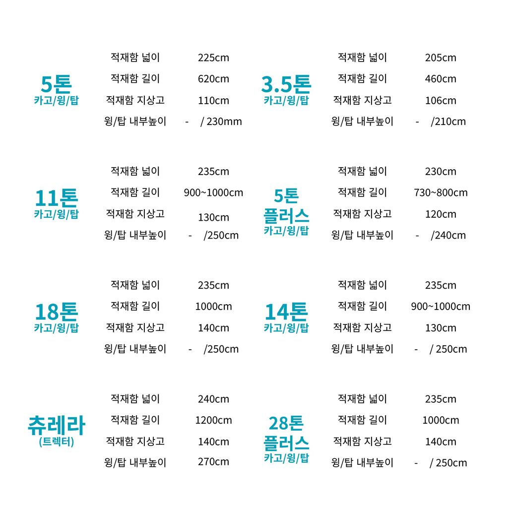 | 운송거리 | 0.5톤 | 1톤 | 1.4톤 | 2.5톤 | 3.5톤 | 5톤 | 5톤축 | 8톤 | 11톤 | 18톤 | 25톤 | 추레라 |